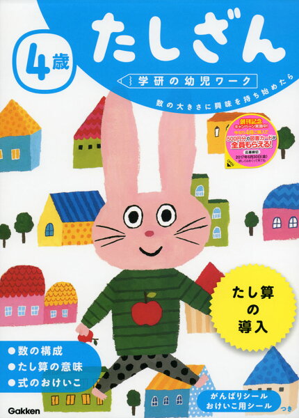 学研の幼児ワーク4歳 たしざんISBN10:4-05-204522-XISBN13:978-4-05-204522-6著作:杉田博之 指導出版社:学研プラス発行日:2017年5月17日仕様:A4判対象:幼児向「左右で4になるように、2つの絵を線で結ぶ」などといった合成や、分解、補数の学習で、10までの数の構成を定着。